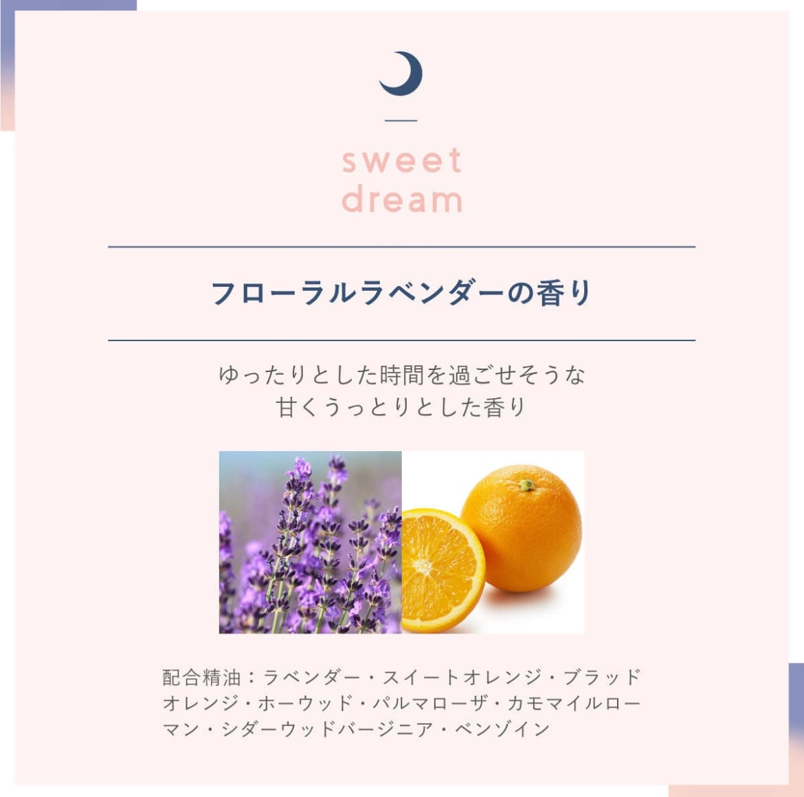 ・配合精油:ラベンダー・スイートオレンジ・ブラッドオレンジ・ホーウッド・パルマローザ・カモマイルローマン・シダーウッドバージニア・ベンゾイン
