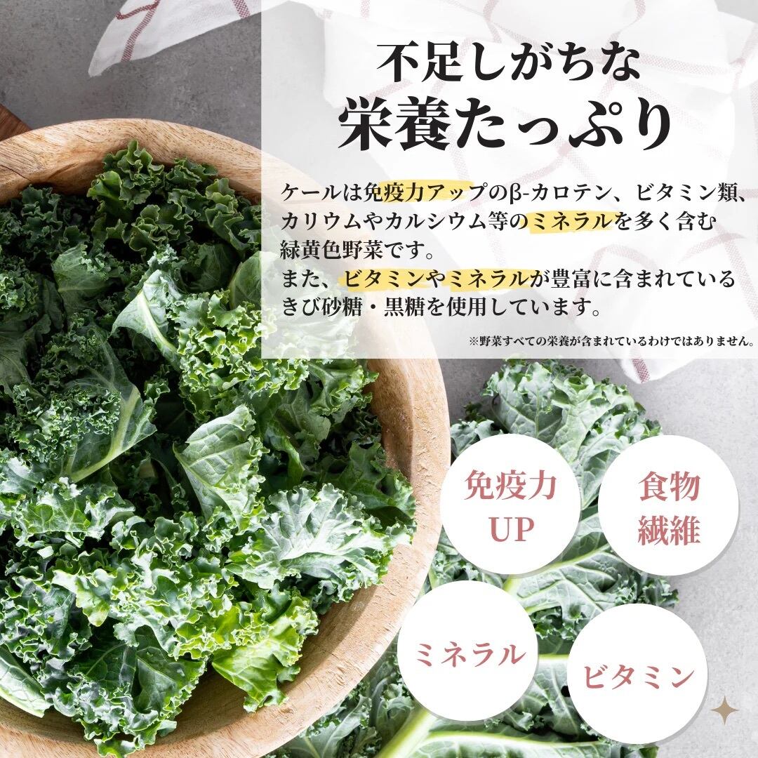 有機ケール(茨城県産)、有機オーツ麦、バナナピューレ、米油、米粉、黒糖、てんさい糖、有機ココナッツチップ、レーズン、デーツ、有機レモン果汁、抹茶、食塩、ジンジャーパウダー、ターメリックパウダー