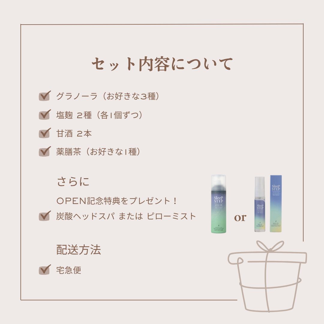お好きなグラノーラ3種、塩麹2種(各1個ずつ)、甘酒2本に加え、お好きな薬膳茶を1種お選びいただけます。