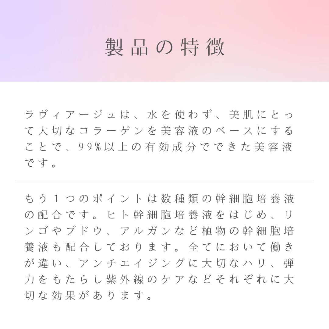 LAVIAGE(ラヴィアージュ)モイスチャーエッセンスは、水を使用せず、コラーゲン発酵液をベースにすることで、99%以上が有効成分で構成された贅沢な処方。角質層までしっかりとうるおいを届け、みずみずしく健やかな肌へ整えます。